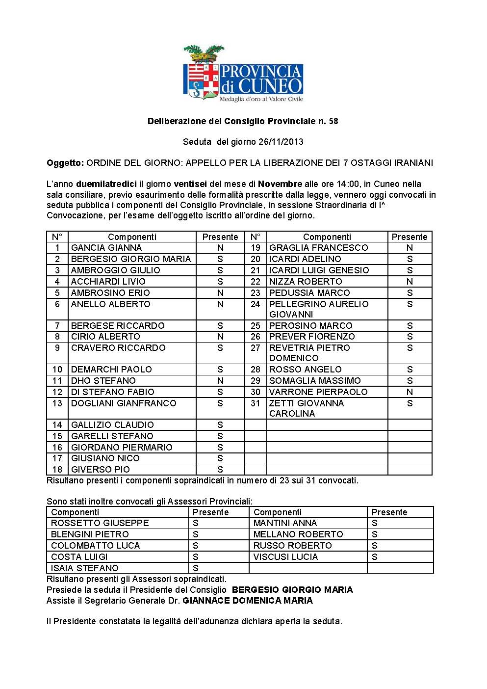 L’anno duemilatredici il giorno ventisei del mese di Novembre alle ore 14:00, in Cuneo nella sala consiliare, previo esaurimento delle formalità prescritte dalla legge, vennero oggi convocati in seduta pubblica i componenti del Consiglio Provinciale, in sessione Straordinaria di I^