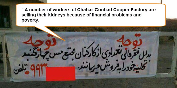 Giovedì 24 Agosto 2017, è stato montato un grosso striscione sulla strada che porta alla Chahar-Gonbad Copper Factory di Sirjan (nella provincia di Kerman) che ha attirato l’attenzione della gente. Sullo striscione c’è scritto “I lavoratori della Chahar-Gonbad Copper Factory stanno vendendo i reni a causa della povertà e dei problemi finanziari”.