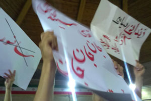 Gli studenti hanno mostrato striscioni, lo hanno chiamato “bugiardo” ed hanno gridato slogans anti-regime come “Liberate i prigionieri politici”, “Non c’è posto per i Basij qui”, “I Basij sono contro il popolo”, “Gli studenti muoiono ma non si fanno umiliare”, “No alla censura” e “L’università non è una caserma militare”.