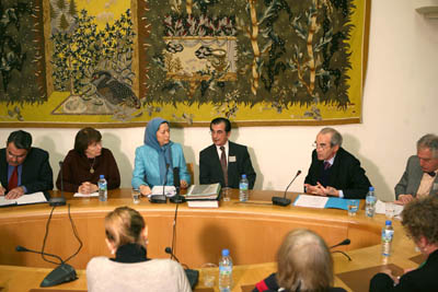 È per ciò che la Comunità internazionale deve adottare una politica di fermezza ", ha dichiarato la signora Rajavi." Tuttavia ha ribadito la sua opposizione ad una guerra contro l’Iran, che perora per una "terza via". "solo la terza via, cioè un cambiamento democratico da parte del popolo iraniano e la sua resistenza organizzata, è capace di salvare il mondo dal pericolo del fascismo religioso". In presenza di Danielle Mitterrand, il coniuge dell’ex presidente della repubblica, il presidente del CNRI ha richiesto di nuovo la rimozione delle "restrizioni" imposte al suo movimento, i cui averi sono stati congelati ed i beni afferrati. Il CNRI è L’ala politica  dell’organizzazione dei  Mojahedine del Popolo Iraniano (OMPI), iscritta dall’Unione europea e gli Stati Uniti sull’elenco delle organizzazioni terroristiche. "quest’iscrizione ingiusta è una forma di violazione dei diritti dell’uomo con danni immensi", ha perorato la signora Rajavi.