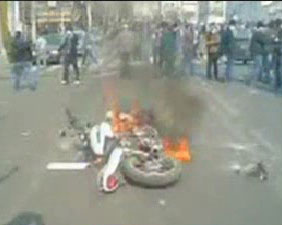 Una motocicletta appartenente alle forze Bassij ( Para-milizia ) è stata istituita una fiammata al bivio di via Hossein Abad e via Vahidi .