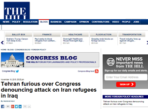 “Membri illustri di entrambi gli schieramenti alla Camera come il Rep. Ed Royce (R-Calif.), Presidente del Comitato Affari Esteri della Camera, il ranking member Eliot Engel (D-N.Y.), i presidenti di tre sotto-comitati, Ileana Ros-Lehtinen (R-Fla.), Ted Poe (R-Texas) e Dana Rohrabacher (R-Calif.), a cui si è unito il Rep. Brad Sherman (D-Calif.) e molti altri, hanno condannato l’attacco e chiesto a Washington più misure a protezione dei rifugiati iraniani rimasti a Camp Liberty”.