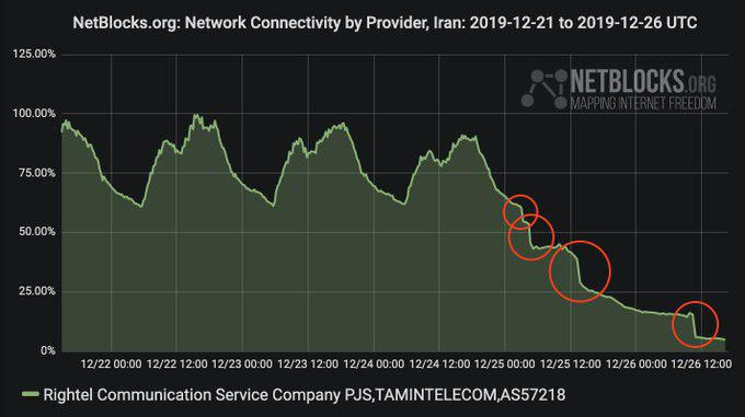 L’organizzazione non governativa di Netblocks.org che monitora la sicurezza informatica e la governance di Internet, conferma che Internet è stata chiusa quasi completamente dal regime il 26 dicembre 2019